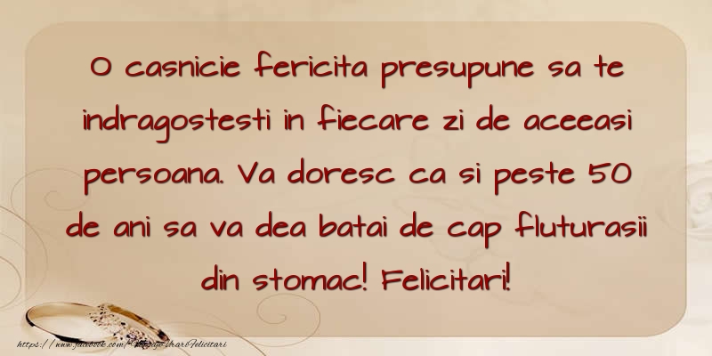O casnicie fericita presupune sa te indragostesti in fiecare zi de aceeasi persoana. Va doresc ca si peste 50 de ani sa va dea batai de cap fluturasii din stomac! Felicitari!