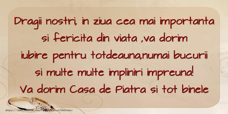 Dragii nostri, in ziua cea mai importanta si fericita din viata ,va dorim iubire pentru totdeauna,numai bucurii si multe multe impliniri impreuna! Va dorim Casa de Piatra si tot binele din lume!