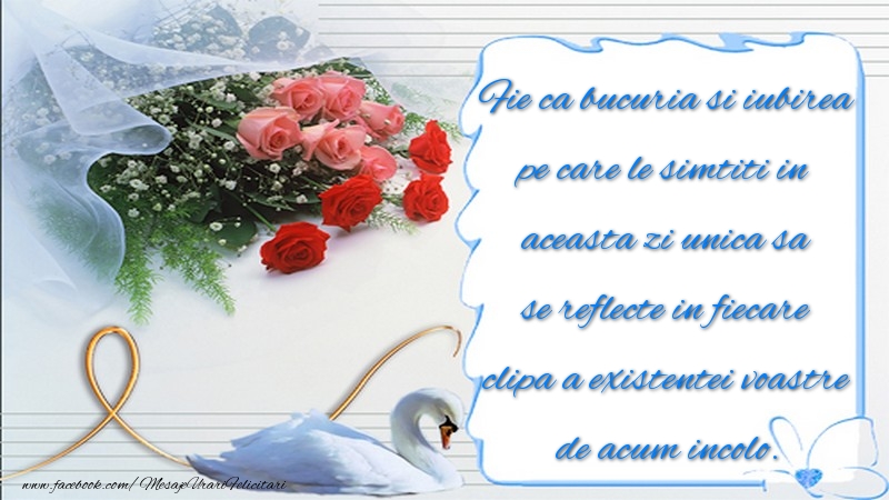 Fie ca bucuria si iubirea pe care le simtiti in aceasta zi unica sa se reflecte in fiecare clipa a existentei voastre de acum incolo.