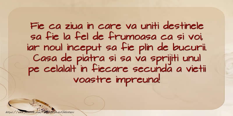 Fie ca ziua in care va uniti destinele sa fie la fel de frumoasa ca si voi, iar noul inceput sa fie plin de bucurii. Casa de piatra si sa va sprijiti unul pe celalalt in fiecare secunda a vietii voastre impreuna!