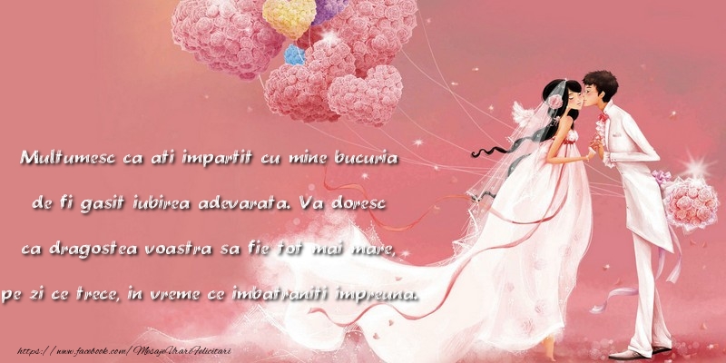 Multumesc ca ati impartit cu mine bucuria de fi gasit iubirea adevarata. Va doresc ca dragostea voastra sa fie tot mai mare, pe zi ce trece, in vreme ce imbatraniti impreuna.