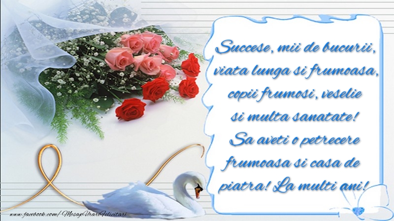 Succese, mii de bucurii, viata lunga si frumoasa, copii frumosi, veselie si multa sanatate! Sa aveti o petrecere frumoasa si casa de piatra! La multi ani!