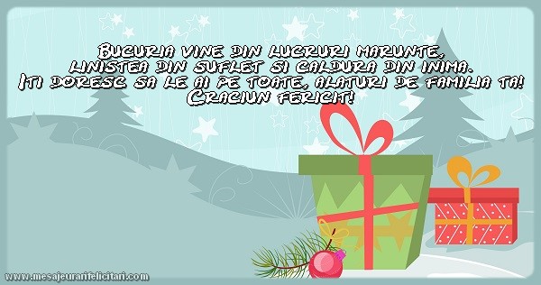 Bucuria vine din lucruri marunte, linistea din suflet si caldura din inima. Iti doresc sa le ai pe toate, alaturi de familia ta! Craciun fericit!