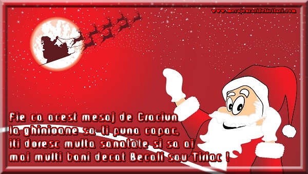 Fie ca acest mesaj de Craciun la ghinioane sa-ti puna capac, iti doresc multa sanatate si sa ai mai multi bani decat Becali sau Tiriac :))!