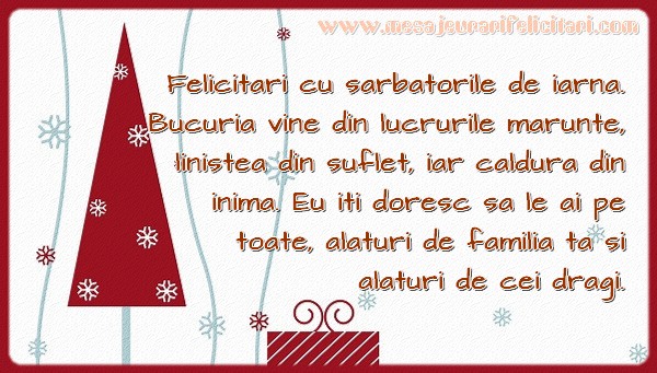 Felicitari cu sarbatorile de iarna. Bucuria vine din lucrurile marunte, linistea din suflet, iar caldura din inima. Eu iti doresc sa le ai pe toate, alaturi de familia ta si alaturi de cei dragi. Craciun Fericit!