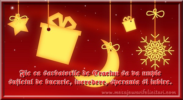 Fie ca sarbatorile de Craciun sa va umple sufletul de bucurie, incredere, speranta si iubire. Iar Mosul sa aduca cele mai dorite si neasteptate cadouri voua si celor dragi. LA MULTI ANI CU SANATATE!