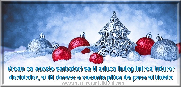 Vreau ca aceste sarbatori sa-ti aduca indeplinirea tuturor dorintelor, si iti doresc o vacanta plina de pace si liniste, si mai ales multa ninsoare, pentru ca stiu cat de mult iti place.