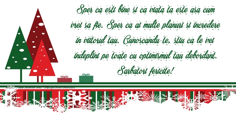 Sper ca esti bine si ca viata ta este asa cum vrei sa fie. Sper ca ai multe planuri si incredere in viitorul tau. Cunoscandu-te, stiu ca le vei indeplini pe toate cu optimismul tau debordant. Sarbatori fericite!