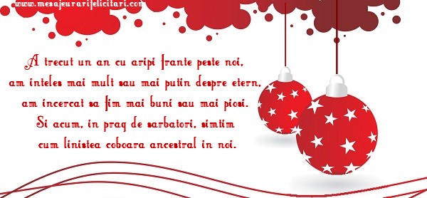 A trecut un an cu aripi frante peste noi, am inteles mai mult sau mai putin despre etern, am incercat sa fim mai buni sau mai piosi. Si acum, in prag de sarbatori, simtim cum linistea coboara ancestral in noi. Imbujorati de sentimente hibernale, cand sufletele noastre trimit atata drag spre voi, cu inima deschisa va uram tot ce-i mai bun in aste sfinte sarbatori! Un an nou fericit si "La multi ani!"