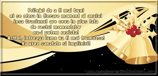 Prilejul de a fi mai buni ni se ofera in fiecare moment al anului insa Craciunul are ceva in plus fata de restul momentelor nu-i putem rezista! Astfel, intreaga lume va fi mai frumoasa! Va urez sanatate si impliniri!