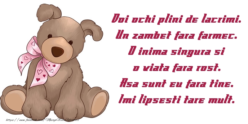 Doi ochi plini de lacrimi. Un zambet fara farmec. O inima singura si o viata fara rost. Asa sunt eu fara tine. Imi lipsesti tare mult.