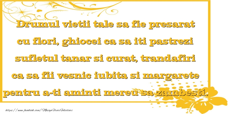 Drumul vietii tale sa fie presarat cu flori, ghiocei ca sa iti pastrezi sufletul tanar si curat, trandafiri ca sa fii vesnic iubita si margarete pentru a-ti aminti mereu sa zambesti. Esti cea mai aleasa floare intre flori!