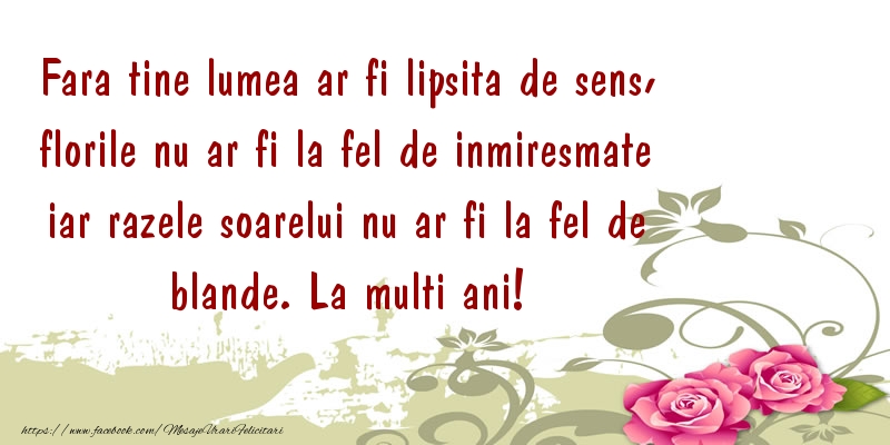 Fara tine lumea ar fi lipsita de sens, florile nu ar fi la fel de inmiresmate iar razele soarelui nu ar fi la fel de blande. La multi ani!