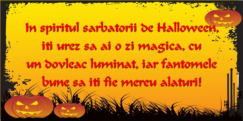 In spiritul sarbatorii de Halloween, iti urez sa ai o zi magica, cu un dovleac luminat, iar fantomele bune sa iti fie mereu alaturi!