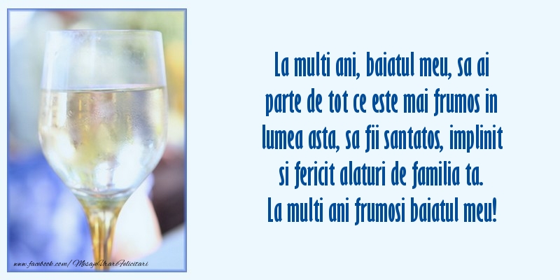 La multi ani, baiatul meu, sa ai parte de tot ce este mai frumos in lumea asta, sa fii santatos, implinit si fericit alaturi de familia ta. La multi ani frumosi baiatul meu!