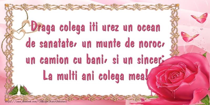 Draga colega iti urez un ocean de sanatate, un munte de noroc, un camion cu bani, si un sincer: La multi ani colega mea!