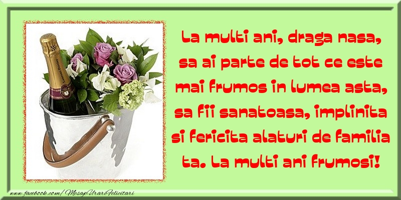 La multi ani, draga nasa, sa ai parte de tot ce este mai frumos in lumea asta, sa fii sanatoasa, implinita si fericita alaturi de familia ta. La multi ani frumosi!