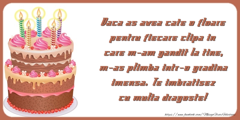 Iti multumesc pentru toti anii in care ai fost primul gand dimineata si ultimul seara iar fiecare an mai frumos ca cel care a trecut. Daca ar trebui s-o iau de la început, as face la fel. Daca as avea cate o floare pentru fiecare clipa in care m-am gandit la tine, m-as plimba intr-o gradina imensa. Te imbratisez cu multa dragoste!