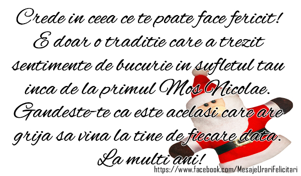 Crede in ceea ce te poate face fericit! E doar o traditie care a trezit sentimente de bucurie in sufletul tau inca de la primul Mos Nicolae. Gandeste-te ca este acelasi care are grija sa vina la tine de fiecare data. La multi ani!