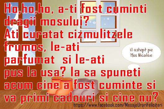 Ho,ho,ho, a-ti fost cuminti dragii mosului? Ati curatat cizmulitzele frumos, le-ati parfumat si le-ati pus la usa? Ia sa spuneti acum cine a fost cuminte si va primi cadouri si cine nu?