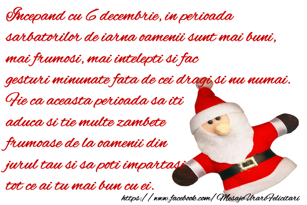 Incepand cu 6 decembrie, in perioada sarbatorilor de iarna oamenii sunt mai buni, mai frumosi, mai intelepti si fac o gesturi minunate fata de cei dragi si nu numai. Fie ca aceasta perioada sa iti aduca si tie multe zambete frumoase de la oamenii din jurul tau si sa poti impartasi tot ce ai tu mai bun cu ei.