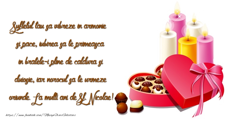 Sufletul tau sa vibreze in armonie si pace, iubirea sa te primeasca in bratele-i pline de caldura si duiosie, iar norocul sa te urmeze oriunde. La multi ani de Sf. Nicolae!