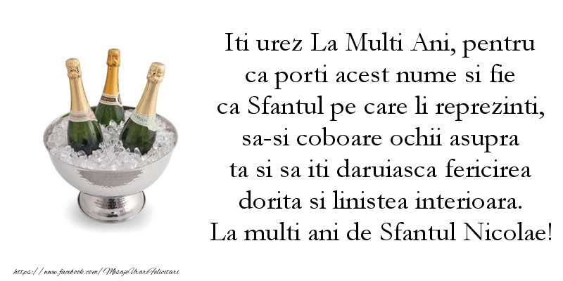 Iti urez La Multi Ani, pentru ca porti acest nume si fie ca Sfantul pe care li reprezinti, sa-si coboare ochii asupra ta si sa iti daruiasca fericirea dorita si linistea interioara. La multi ani de Sfantul Nicolae!