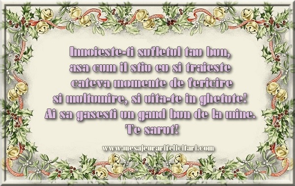 Innoieste-ti sufletul tau bun, asa cum il stiu eu si traieste cateva momente de fericire si multumire, si uita-te in ghetute! Ai sa gasesti un gand bun de la mine. Te sarut!