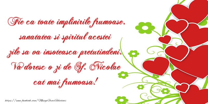 Fie ca toate implinirile frumoase, sanatatea si spiritul acestei zile sa va insoteasca pretutindeni. Va doresc o zi de Sf. Nicolae cat mai frumoasa!