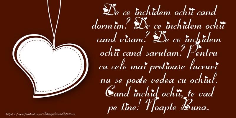 De ce inchidem ochii cand dormim? De ce inchidem ochii cand visam? De ce inchidem ochii cand sarutam? Pentru ca cele mai pretioase lucruri nu se poate vedea cu ochiul. Cand inchid ochii, te vad pe tine! Noapte Buna.