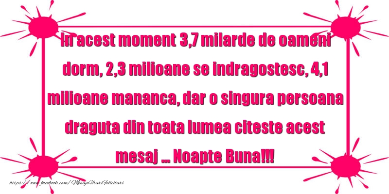 In acest moment 3,7 milarde de oameni dorm, 2,3 milioane se indragostesc, 4,1 milioane mananca, dar o singura persoana draguta din toata lumea citeste acest mesaj ... Noapte Buna!!!