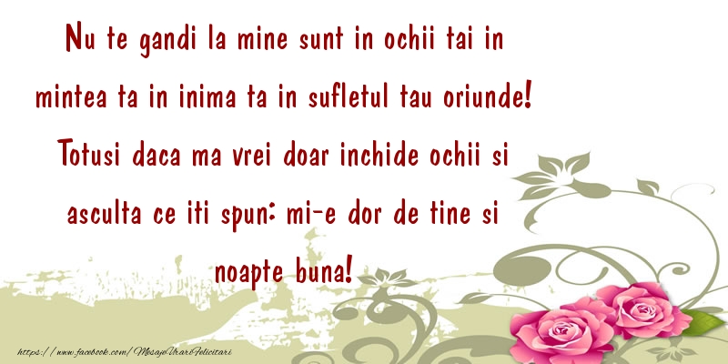 Nu te gandi la mine sunt in ochii tai in mintea ta in inima ta in sufletul tau oriunde! Totusi daca ma vrei doar inchide ochii si asculta ce iti spun: mi-e dor de tine si noapte buna!
