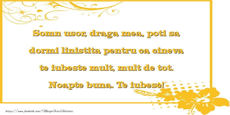Somn usor, draga mea, poti sa dormi linistita pentru ca cineva te iubeste mult, mult de tot. Noapte buna. Te iubesc!