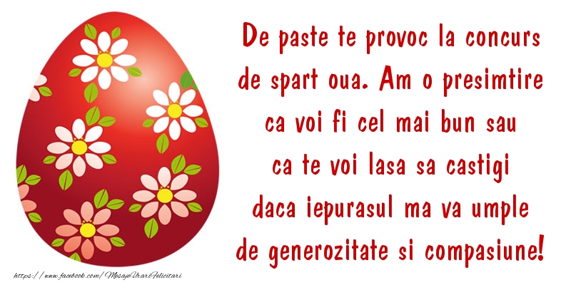 De paste te provoc la concurs de spart oua. Am o presimtire ca voi fi cel mai bun sau ca te voi lasa sa castigi daca iepurasul ma va umple de generozitate si compasiune! Ce zici? Te risti?