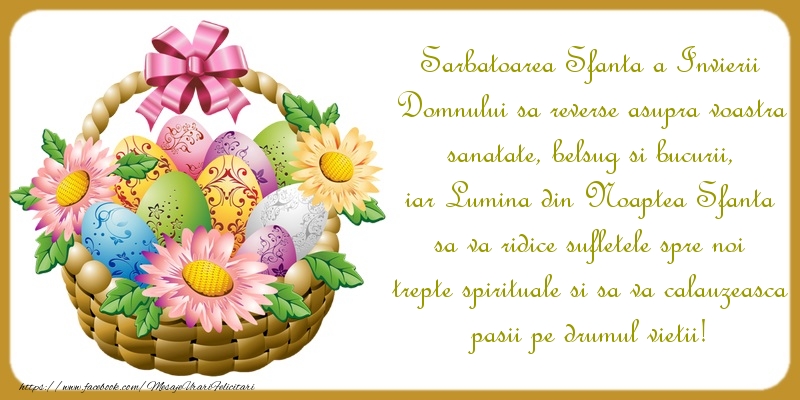 Sarbatoarea Sfanta a Invierii Domnului sa reverse asupra voastra sanatate, belsug si bucurii, iar Lumina din Noaptea Sfanta sa va ridice sufletele spre noi trepte spirituale si sa va calauzeasca pasii pe drumul vietii!