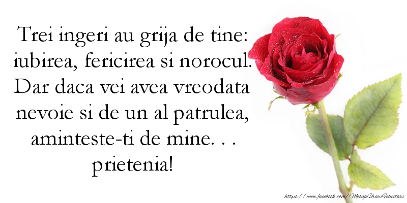 Trei ingeri au grija de tine: iubirea, fericirea si norocul. Dar daca vei avea vreodata nevoie si de un al patrulea, aminteste-ti de mine. . . prietenia!