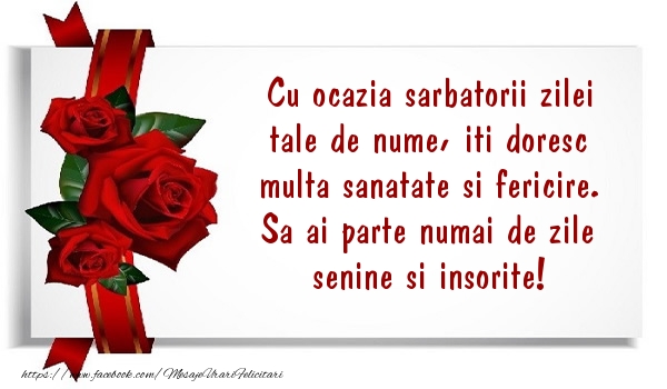 Cu ocazia sarbatorii zilei tale de nume, iti doresc multa sanatate si fericire. Sa ai parte numai de zile senine si insorite!