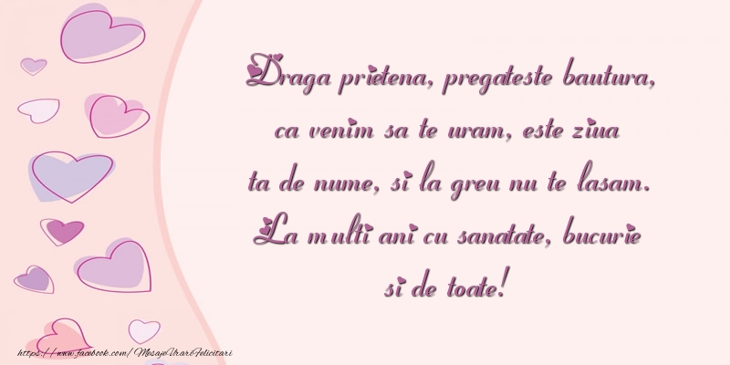 Draga prietena, pregateste bautura, ca venim sa te uram, este ziua ta de nume, si la greu nu te lasam. La multi ani cu sanatate, bucurie si de toate!
