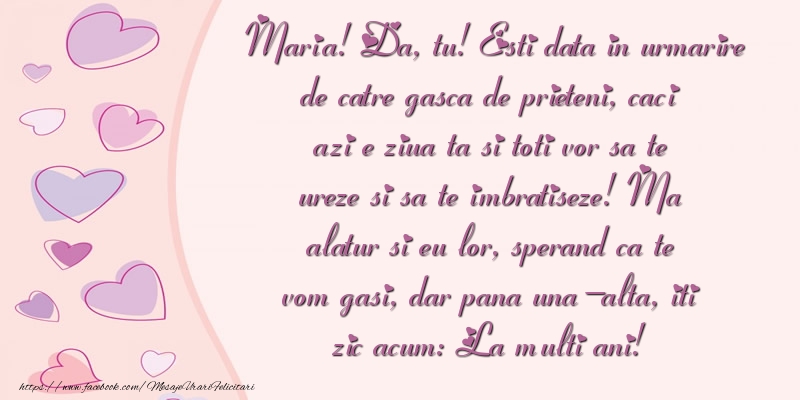 Maria! Da, tu! Esti data in urmarire de catre gasca de prieteni, caci azi e ziua ta si toti vor sa te ureze si sa te imbratiseze! Ma alatur si eu lor, sperand ca te vom gasi, dar pana una-alta, iti zic acum: La multi ani!