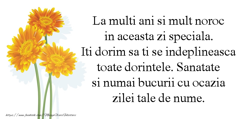 La multi ani si mult noroc in aceasta zi speciala. Iti dorim sa ti se indeplineasca toate dorintele. Sanatate si numai bucurii cu ocazia zilei tale de nume.