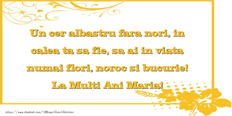 Un cer albastru fara nori, in calea ta sa fie, sa ai in viata numai flori, noroc si bucurie! La Multi Ani Maria!
