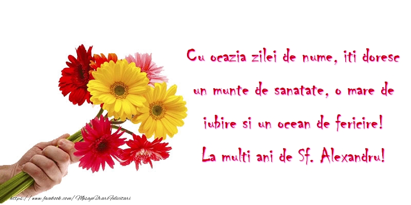 Cu ocazia zilei de nume, iti doresc un munte de sanatate, o mare de iubire si un ocean de fericire! La multi ani de Sf. Alexandru!