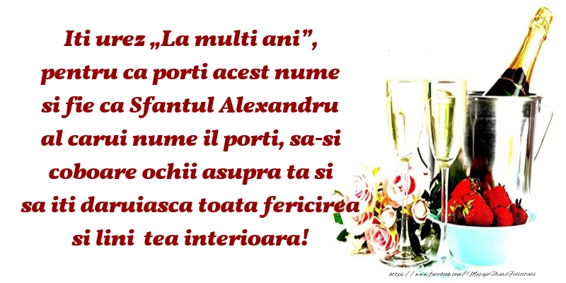 Iti urez „La multi ani”, pentru ca porti acest nume si fie ca Sfantul Alexandru al carui nume il porti, sa-si coboare ochii asupra ta si sa iti daruiasca toata fericirea si liniștea interioara!