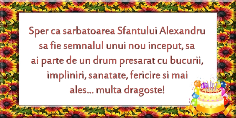 Sper ca sarbatoarea Sfantului Alexandru sa fie semnalul unui nou inceput, sa ai parte de un drum presarat cu bucurii, impliniri, sanatate, fericire si mai ales... multa dragoste!
