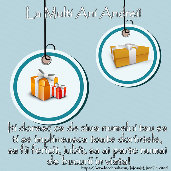 Iti doresc ca de ziua numelui tau sa ti se implineasca toate dorintele, sa fii fericit, iubit, sa ai parte numai de bucurii in viata si iti urez un sincer La Multi Ani Andrei!