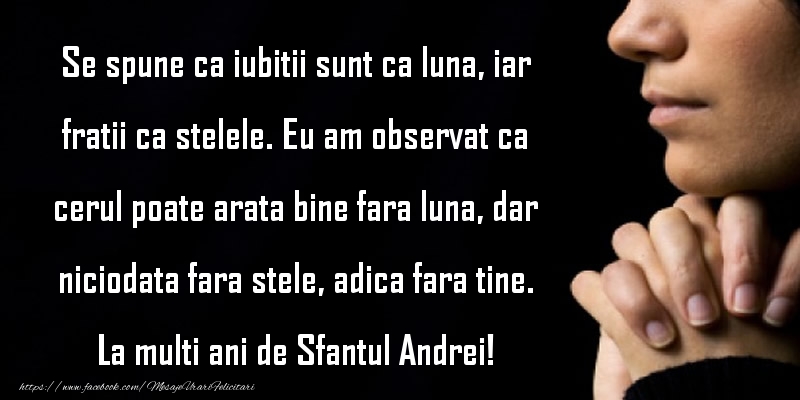 Se spune ca iubitii sunt ca luna, iar fratii ca stelele. Eu am observat ca cerul poate arata bine fara luna, dar niciodata fara stele, adica fara tine. La multi ani de Sfantul Andrei!