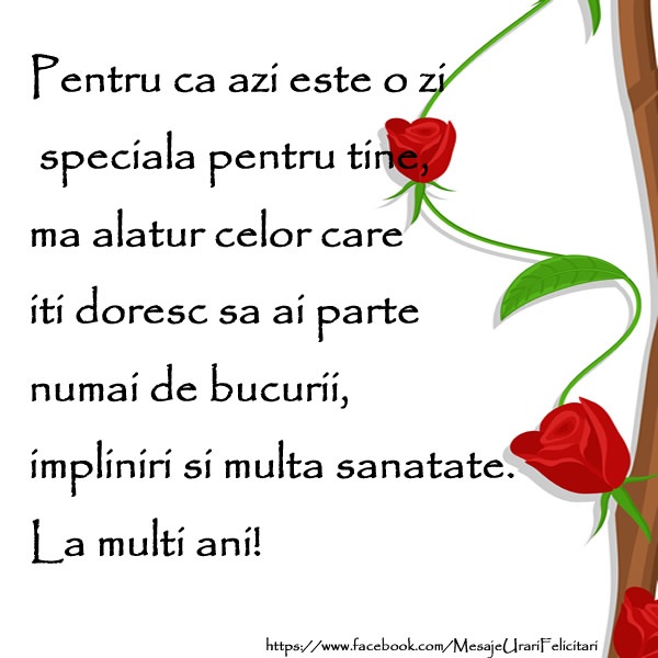 Pentru ca azi este o zi speciala pentru tine, ma alatur celor care iti doresc sa ai parte numai de bucurii, impliniri si multa sanatate. La multi ani!