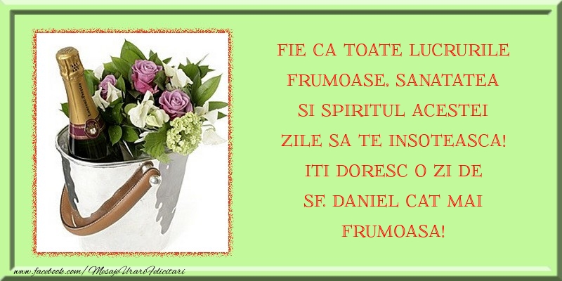 Fie ca toate lucrurile frumoase, sanatatea si spiritul acestei zile sa te insoteasca! Iti doresc o zi de Sf. Daniel cat mai frumoasa!