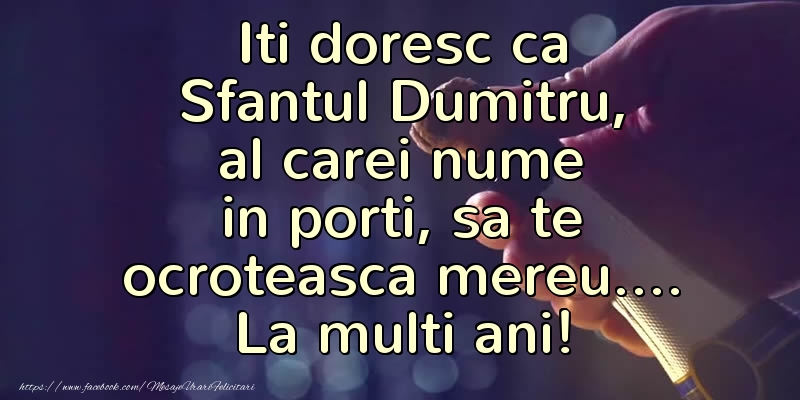 Iti doresc ca Sfantul Dumitru, al carei nume il porti, sa te ocroteasca mereu, sa iti calauzeasca pasii spre munti de bucurie si sa iti lumineze calea in viata. La multi ani fericiti, acum si intotdeauna!