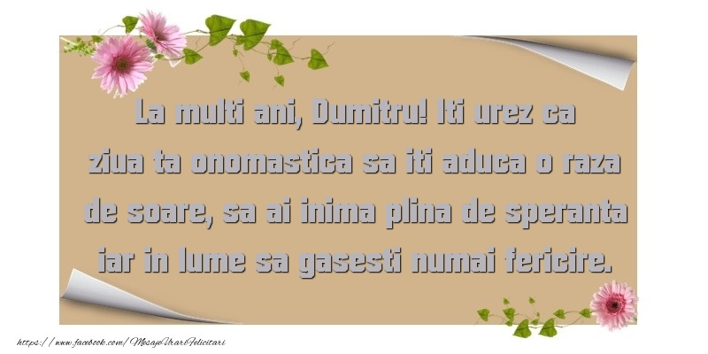 La multi ani, Dumitru! Iti urez ca ziua ta onomastica sa iti aduca o raza de soare, sa ai inima plina de speranta iar in lume sa gasesti numai fericire.